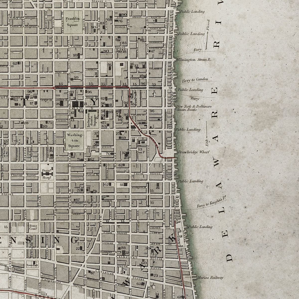 The detail reveals a city in motion—new neighborhoods sprouting beyond the Delaware, the methodical expansion of streets that would soon house waves of immigrants and industry. Every ward boundary and waterway speaks to the ambitions of a young republic building its future, block by carefully planned block.